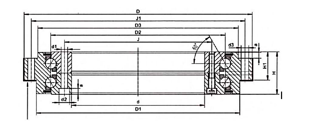 | d | D | H | H1 | D1 | D2 | D3 | J | J1 | a | Внутреннее кольцо | Наружное кольцо | ||||