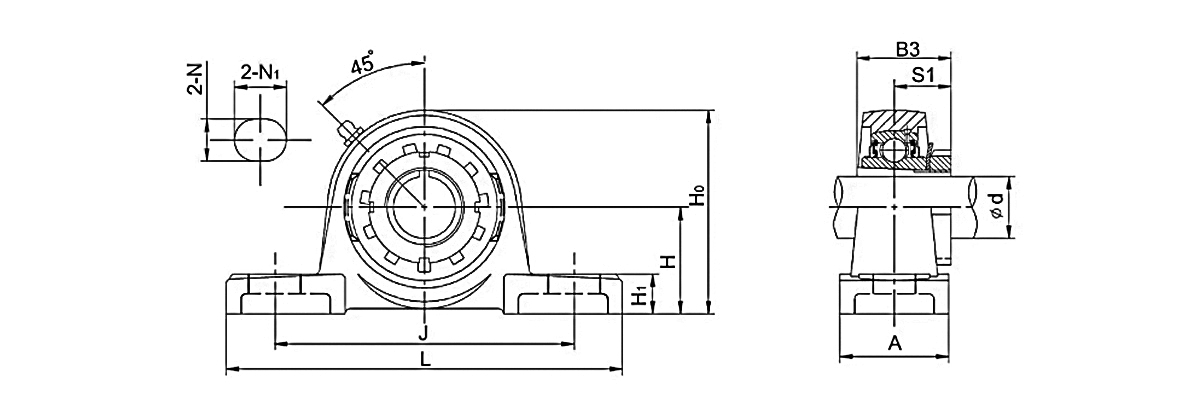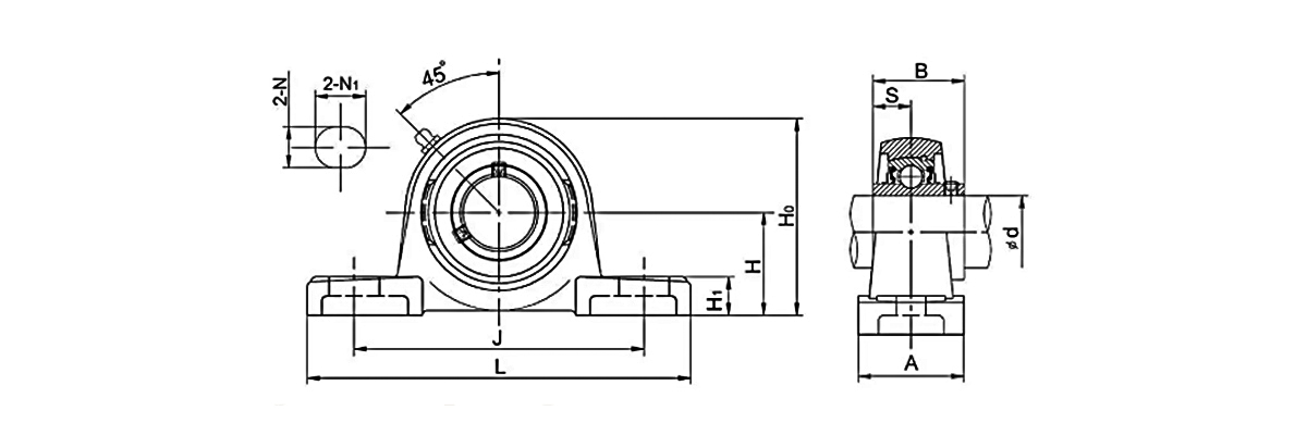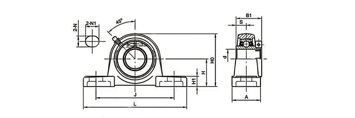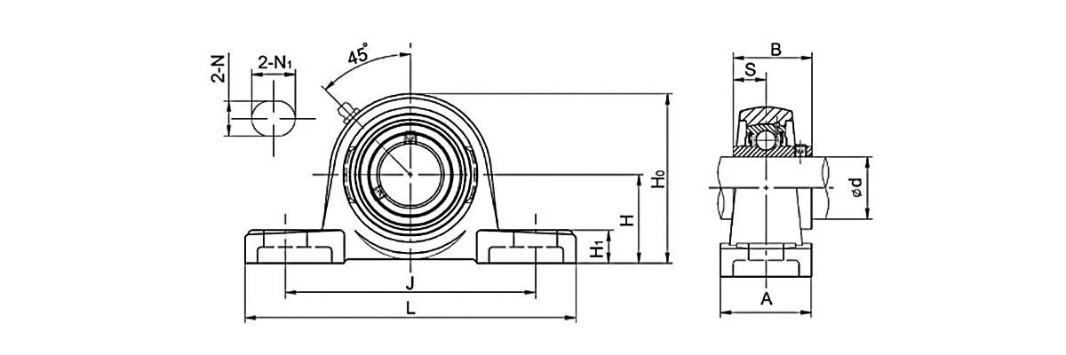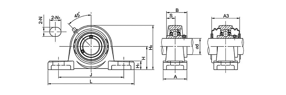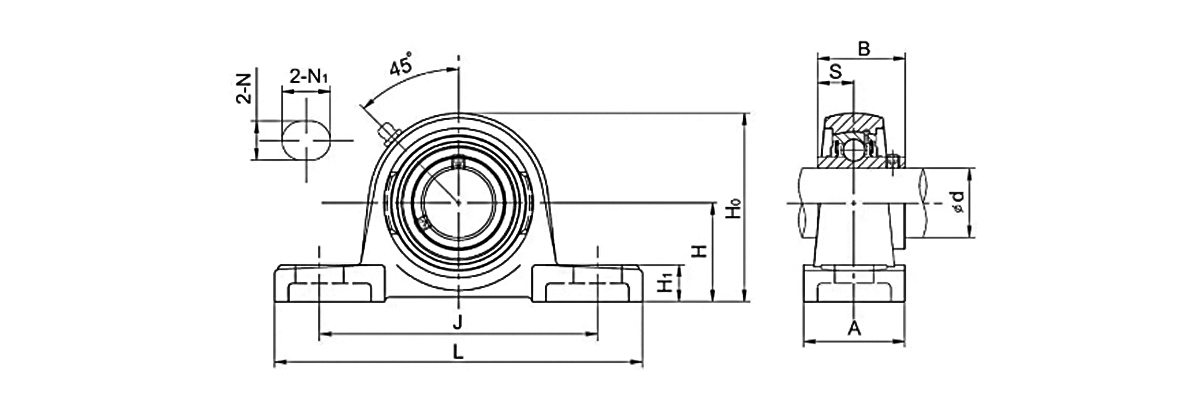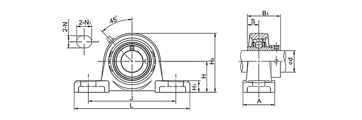 Подшипник этого типа содержит монтажный блок (подушку). Подшипник установлен внутри монтажного блока.